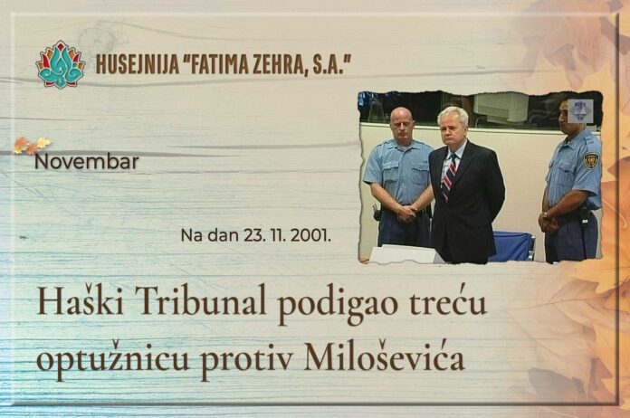 Haški tribunal (Den Haag) je 23. novembra 2001. godine podigao treću i najtežu optužnicu protiv Slobodana Miloševića. Prve dvije optižnice su se odnosile na zločine počinjene u Hrvatskoj i Kosovu, a treća na zločine u Bosni i Hercegovini. (Zločin protiv čovječnosti, kršenje običaja rata i Ženevske konvencije)
